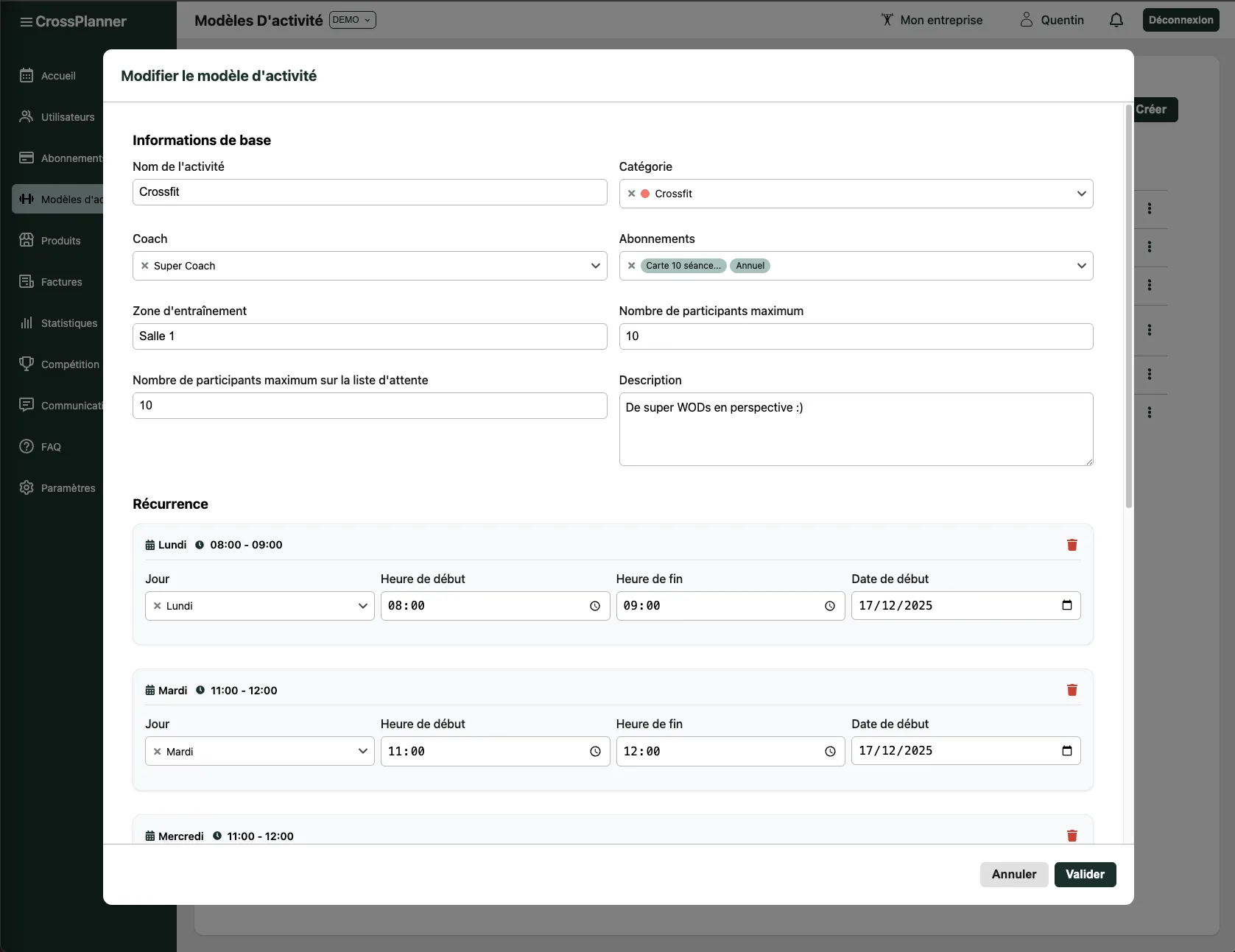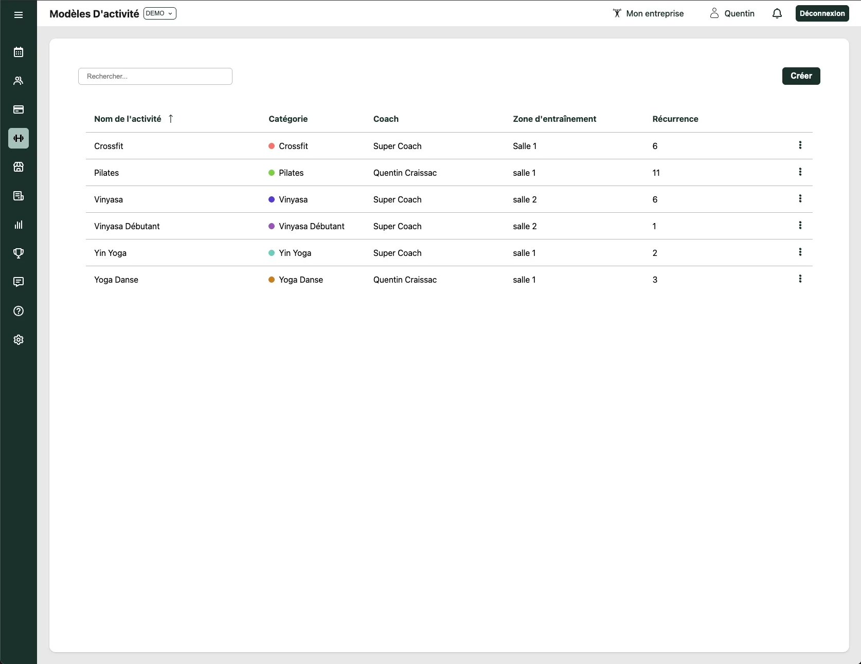 Personnalisez vos activités et réutilisez-les dans le planning en un clic pour gagner du temps. Ajustez les paramètres clés : catégorie, coach, zones et abonnements autorisés, pour contrôler avec quels abonnements les adhérents peuvent s’inscrire.